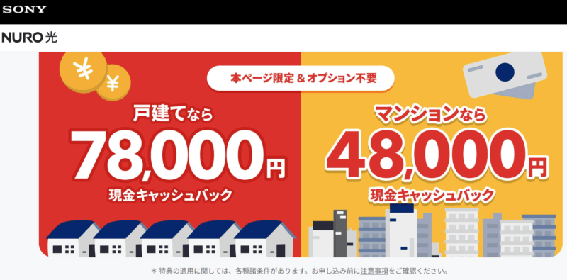 さらに戸建て住宅 1G・10Gプラン新規契約で60,000円、オプション加入で6,000円キャッシュバックなので最大72,000円のキャッシュバックとなります。