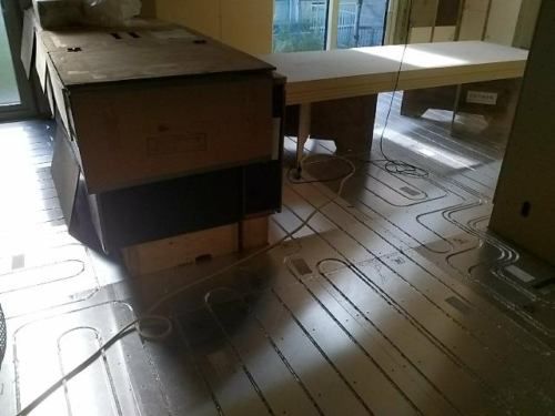 全館床(冷)暖房は、下の写真のように床全面に配管を通し、その配管に温冷水を流し床を温めたり冷ましたりする仕組みです。